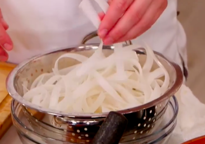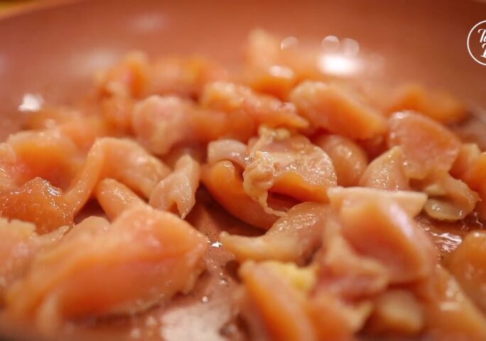 Cut chicken breast into thin flat pieces. Quickly marinate the chicken: sesame oil, white pepper, lime juice, fish sauce, and white sugar. Sear one side and kiss the other side then rest.