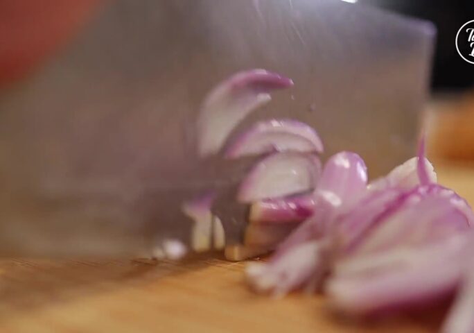 Cut tofu into small squares. Slice shallots thin. Cut chives into batons. Prepare 'mis en place' ready for stir fry. There is a lot so make sure to have all ingredients in separate bowls.