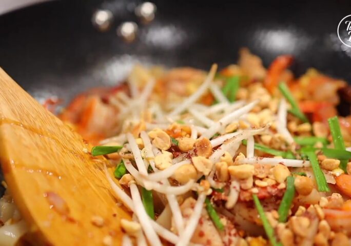 Cook shallots and egg first. Add the noodles and sauce. Add small prawns and tofu. Then add everything else and toss through. Cooked proteins, bean sprouts, chives, salted radish, cilantro.