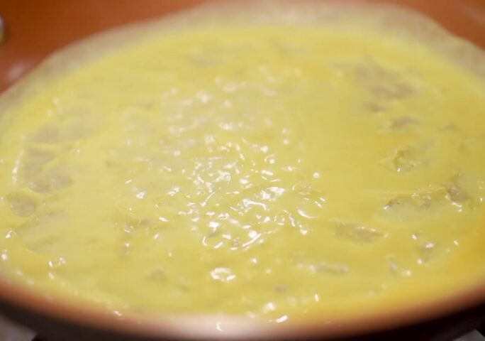 Spread the egg skin: first, beat the eggs in a bowl and pour a little oil, then beat into egg liquid, use a medium non-stick pan, turn on medium-low heat and pour in a little oil, wipe the bottom of the pan with kitchen paper, use less oil. Pour in the egg liquid, and turn the wrist to make the egg liquid flow into a circle, if there is a leak, it doesn’t matter, you can pour a little egg liquid to make up! Note: When pouring the egg liquid, the pot should be off the heat. Do not pour too much egg liquid, otherwise, the egg skin will be very thick. When you see that the egg skin on the edge of the pot is slightly rolled up, you can use a spatula to turn the egg skin over. The egg skin will be more fragrant when it is light golden yellow.