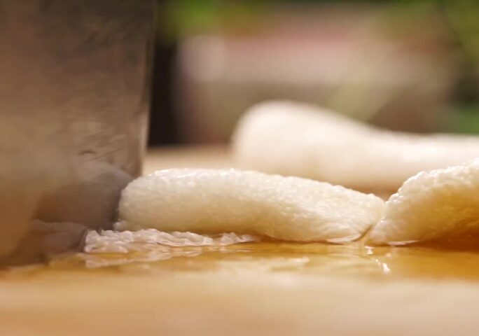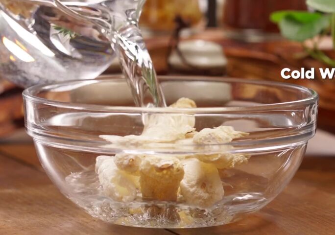 Rehydrate and soak the dried bamboo fungus with cold water in a mixing bowl.
