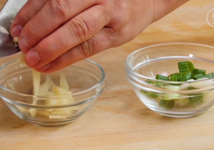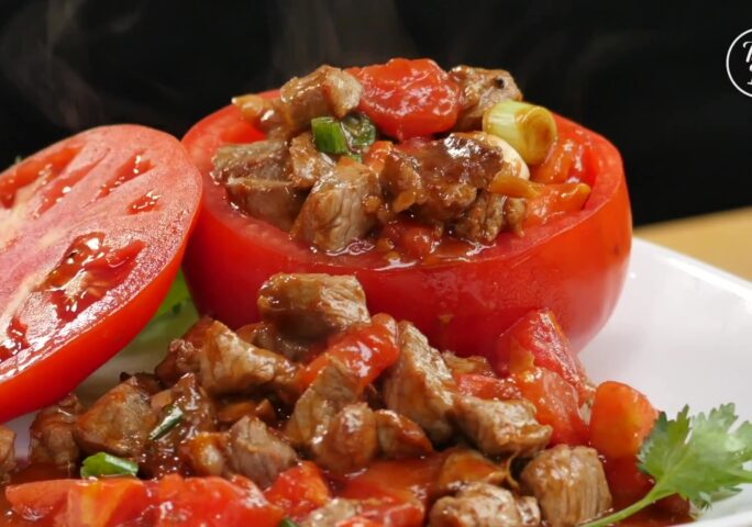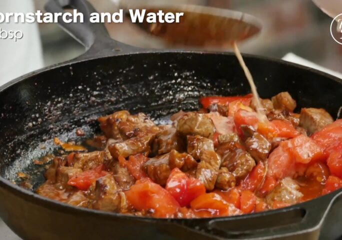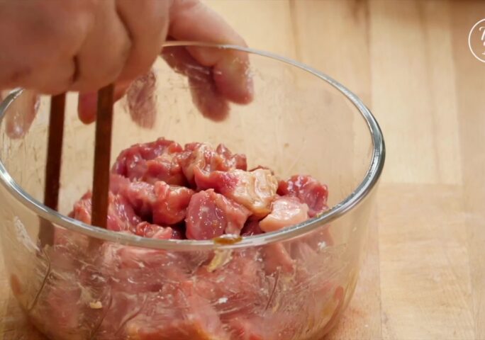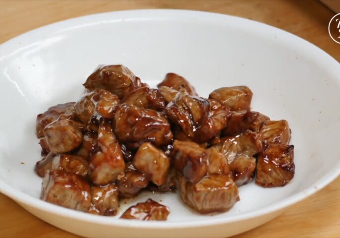 Butterfly the strip steak. Cut into long strips, then into cubes. Marinate with oyster sauce, light soy sauce, sugar, salt, and cornstarch. Mix until all the cornstarch dissolves, then add cooking oil, mix well then marinate for about 15 minutes.
