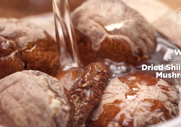 Soak 2 cups of long grain rice in 3 cups of water for 2-3 hours. Soak 1/2oz dried shiitake mushroom in 2cups of water for 2-3 hours. Soak 1oz dried scallop in 1 cup of Shaoxing wine for 2-3 hours.