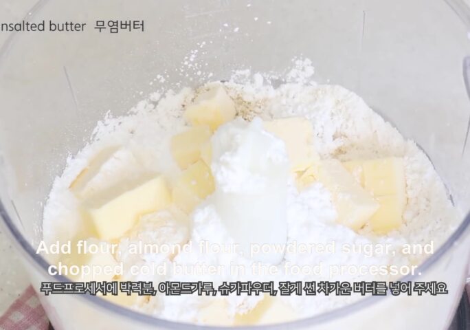 Add flour, almond flour, powdered sugar, and chopped cold butter to the food processor.