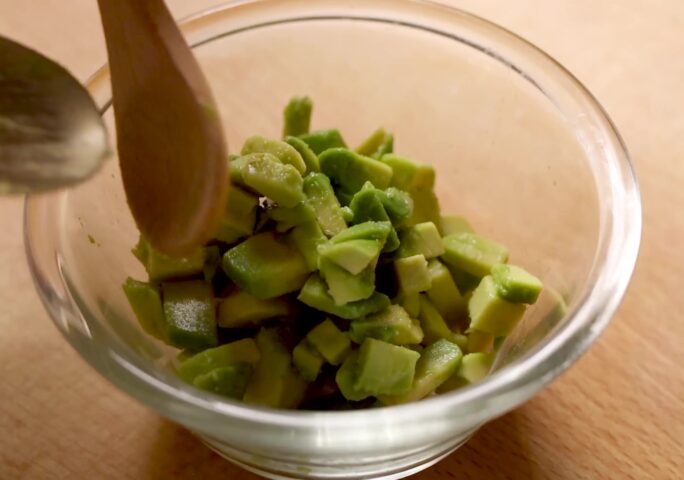 Place diced avocado in a bowl and add 1 tbsp of lime juice, leaving some chunks. Add salt to taste.