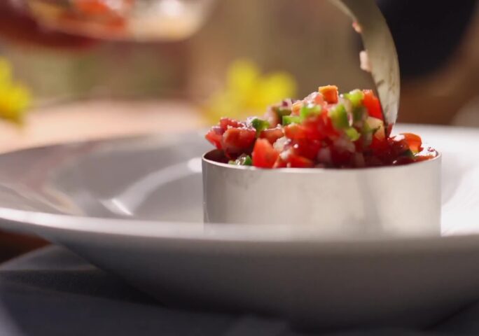 Starting on 1 plate of the 2 servings plates (will repeat the same steps for 2nd plate) make a layer with the diced avocado, using a hamburger mold to keep the round shape of the stack. Then layer half of the tuna mixture on top of the avocado. Top with a fresh layer of the tomato mixture (pico de gallo).