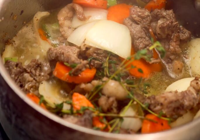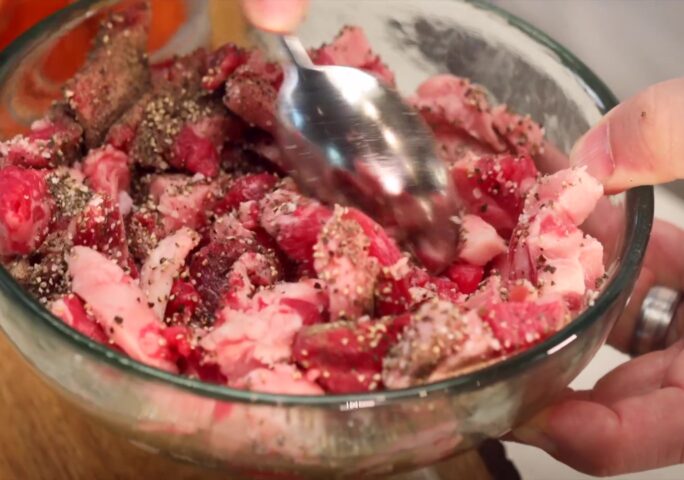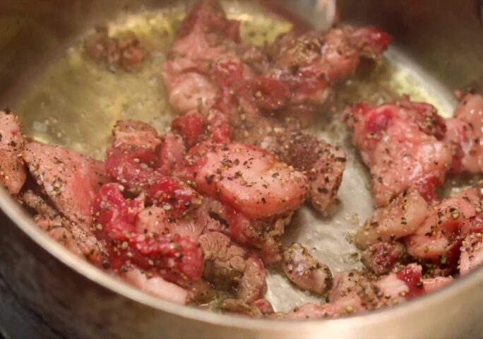 Add some olive oil into a smaller pan. We are going to sautee the beef chunks that were cut out of the steaks, but serve well to provide us with the flavor. Season the beef chunks with salt and pepper and add them to the pan.