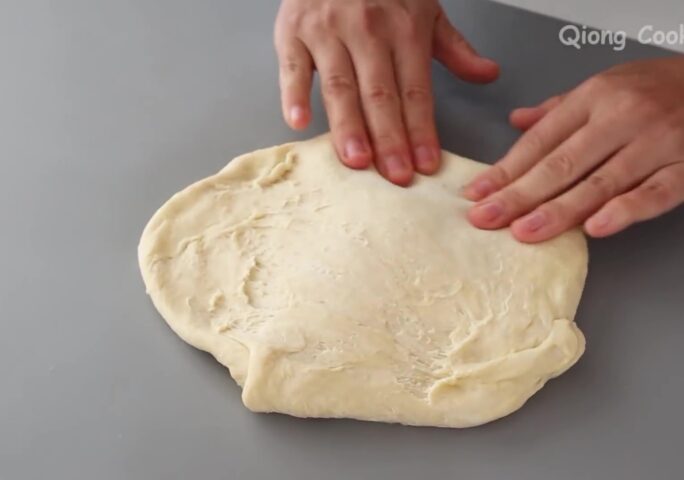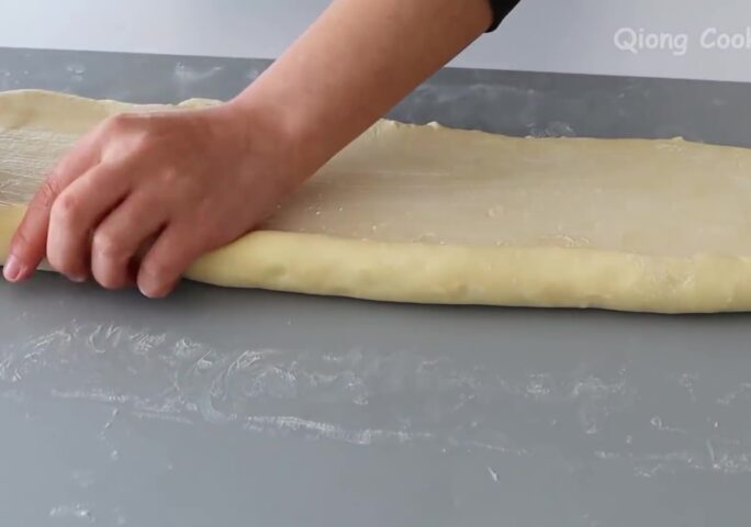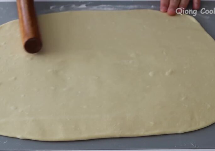 After 20 minutes, flatten the dough. Sprinkle with flour to prevent sticking. Roll into a large rectangular dough sheet.